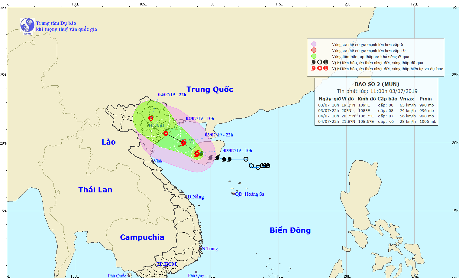 Hồi 10 giờ ngày 03/7, vị trí tâm bão ở vào khoảng 19,2 độ Vĩ Bắc; 109,0 độ Kinh Đông, trên khu vực phía Tây đảo Hải Nam (Trung Quốc), cách huyện đảo Bạch Long Vĩ khoảng 180km, cách đất liền các tỉnh Quảng Ninh-Nam Định khoảng 320km về phía Đông Đông Nam. Sức gió mạnh nhất vùng gần tâm bão mạnh cấp 8 (60-75km/giờ), giật cấp 11. Bán kính gió mạnh cấp 6, giật cấp 8 trở lên khoảng 100km tính từ tâm bão.